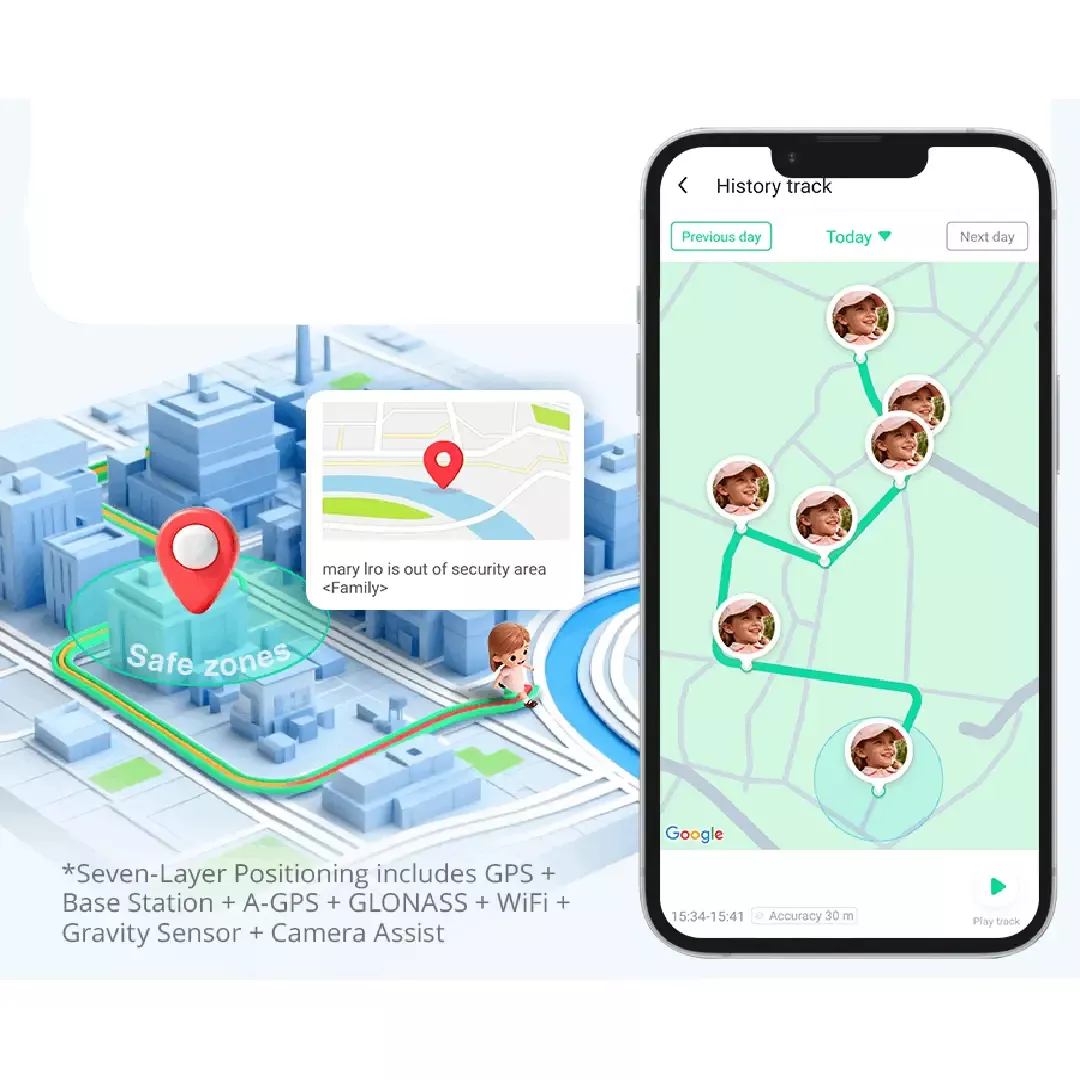 Kako bi roditelji uvijek imali uvid u lokaciju svog djeteta, sat je opremljen naprednim sustavima za pozicioniranje, uključujući čak 7 metoda praćenja. Roditelji će biti odmah obaviješteni ako dijete napusti sigurnu zonu, a u slučaju nestanka, sat može pratiti zadnju poznatu lokaciju. Sat ima i sirenu koja traje 30 sekundi, kao i mogućnost slanja poruke na daljinu, što dodatno povećava sigurnost.
