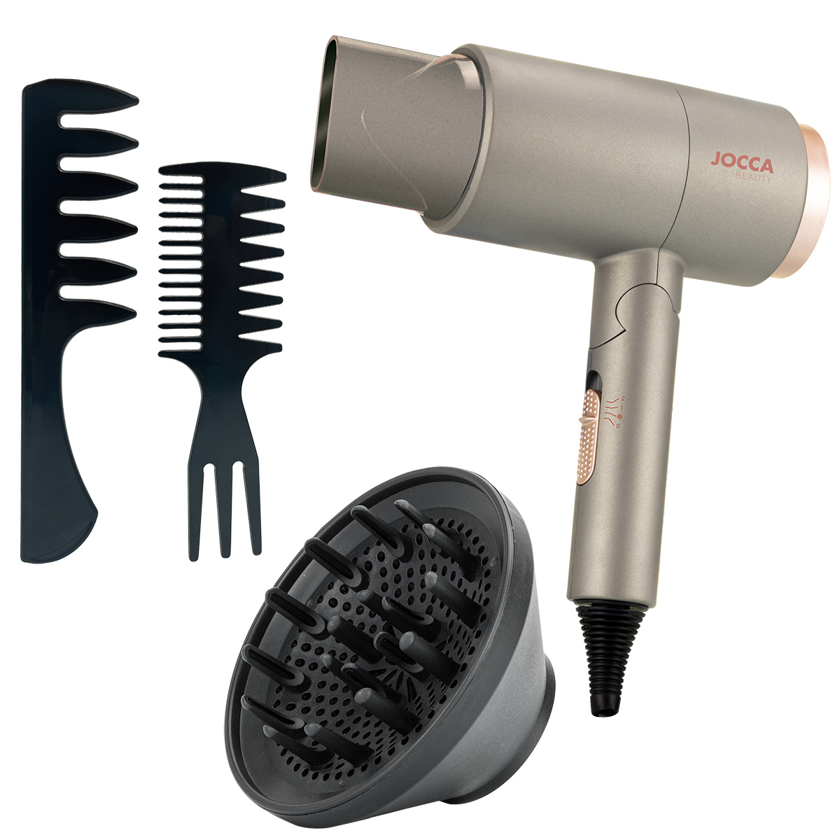 Jocca preklopno sušilo za kosu ima snažan motor do 2000 W i moderan, kompaktan dizajn za učinkovito i brzo sušenje gdje god vam je potrebno! Zahvaljujući sklopivoj ručki, možete ga udobno transportirati i pohraniti bez žrtvovanja performansi uobičajenog sušila za kosu. Jocca sušilo za kosu pruža brz i učinkovit protok zraka za sušenje i oblikovanje vaše kose u nekoliko minuta. Različite postavke temperature i brzine omogućuju vam da prilagodite svoje iskustvo sušenja i prilagodite protok zraka i temperaturu potrebama vaše kose kako bi ostala zdrava, lijepa, fleksibilna i sjajna. Funkcija hlađenja popravlja vašu frizuru. Ovo sušilo ispunjava očekivanja profesionalaca kao i zahtjevnih korisnika!