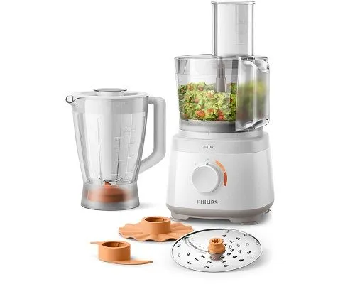 Kompaktni aparat za obradu hrane za svakodnevnu upotrebu zauzima manje prostora na radnoj površini, a ipak je potpuno opremljen svim osnovnim kuhinjskim dodacima koje jednostavno možete spremiti u zdjelu.