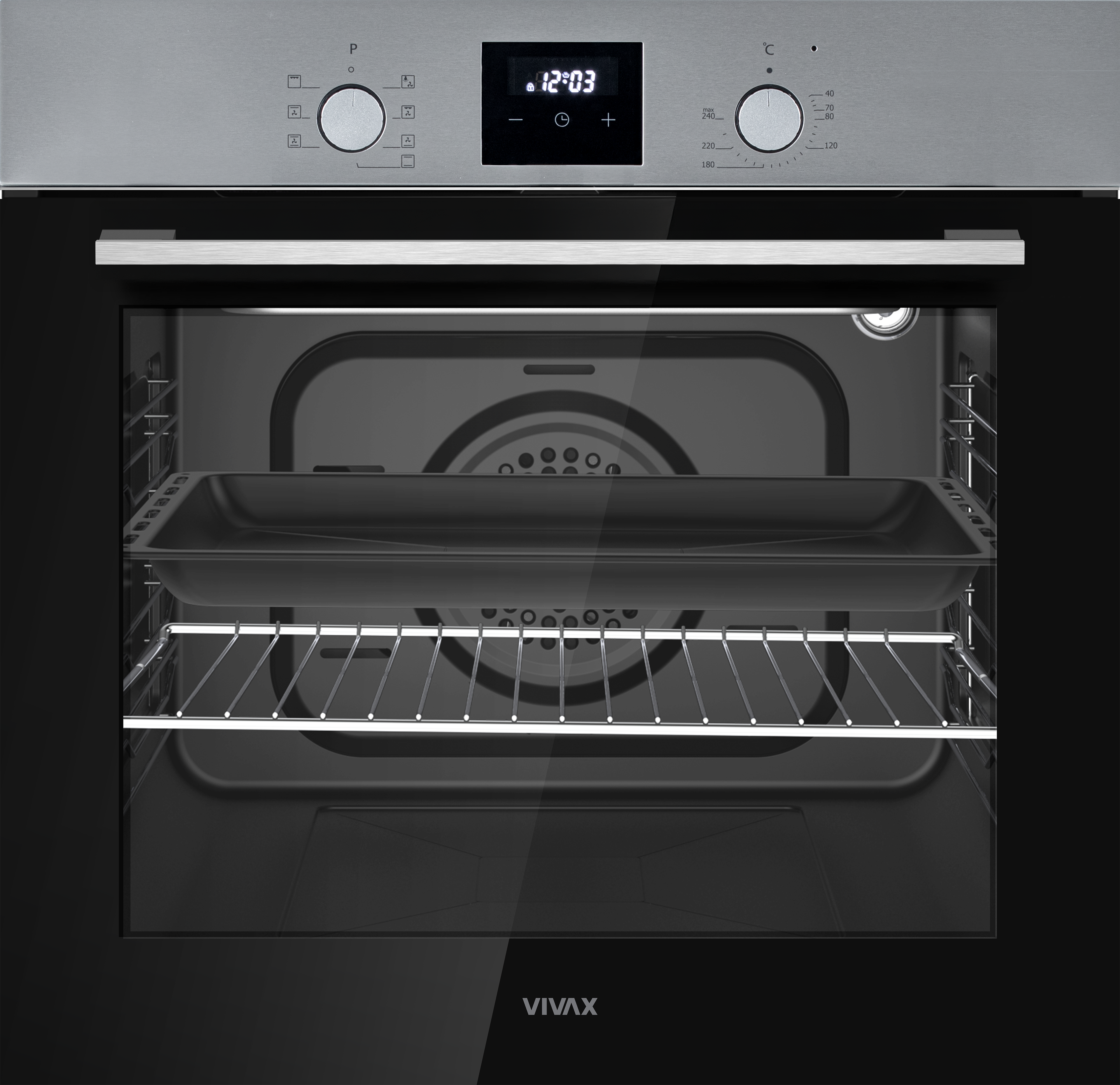 VIVAX ugradbena pećnica BO-808BFD X sa svojim velikim volumenom od 80 l idealna je za potrebe većih obitelji. Opremljena je velikim bijelim LED zaslonom i trima dodirnim tipkama osjetljivim na dodir, a nudi čak 7 programa pečenja.