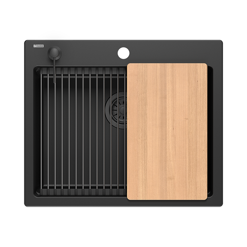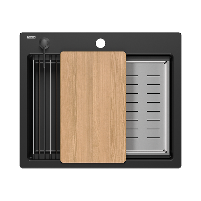 KURT 110 WORKSTATION je granitni sudoper s jednim, iznimno prostranim bazenom, iako stane u ormar 60cm koji je standardni u svakoj kuhinji. Upotrijebljeni granit u kombinaciji s visokokvalitetnim vezivom, stvara vrlo glatku površinu koja pogoduje čistoći. Sudoper je standardno opremljen velikim setom dodatne opreme, što maksimalno olakšava radove u kuhinji. Dozator detedženta za pranje posuđa postavlja se na rub, čime se izbjegava postavljanje dodatnih posuda, a sama tekućina se ne izlijeva izvan ruba sudopera. Unutar bazena sudopera minimalno je urezan nosač čelične kadice za ocjeđivanje i rollmata. Drvena daska za rezanje točno je dimenzionirana prema gornjim rubovima sudopera. Korištenjem ovih elemenata povećava se radna površina u kuhinji i omogućuje vam da uspješno koristite sudoper kao dodatno mjesto za odlaganje, rezanje ili sušenje.