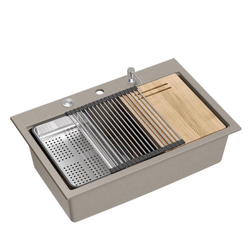 MODEL: Quadron sudoper MARC WORKSTATION taupe/čelik s daljinskim upravljanjem MATERIJAL: GraniteQ NAČIN UGRADNJE: ugradbeni BOJA: taupe DULJINA (mm): 760 ŠIRINA (mm): 500 DUBINA (mm): 235 DULJINA x ŠIRINA BAZENA (mm): 700 x 370 IZVEDBA: - ORMAR (cm): 80 UGRADBENI OTVOR: prema predlošku DALJINSKI UPRAVLJAČ: Push2Open BROJ BAZENA: 1 IZREZANI OTVORI Ø 35mm: 3 UMETAK OTVORA: ne PRIPREMA ZA DODATNE OTVORE: ne SIFON I ODVOD UKLJUČENI: da VRSTA SIFONA: ušteda prostora MOGUĆNOST PRIKLJUČKA PERILICE: da VELIČINA ODVODA: 3 1/2" JAMSTVO: 10 godina EAN: 5905505500343